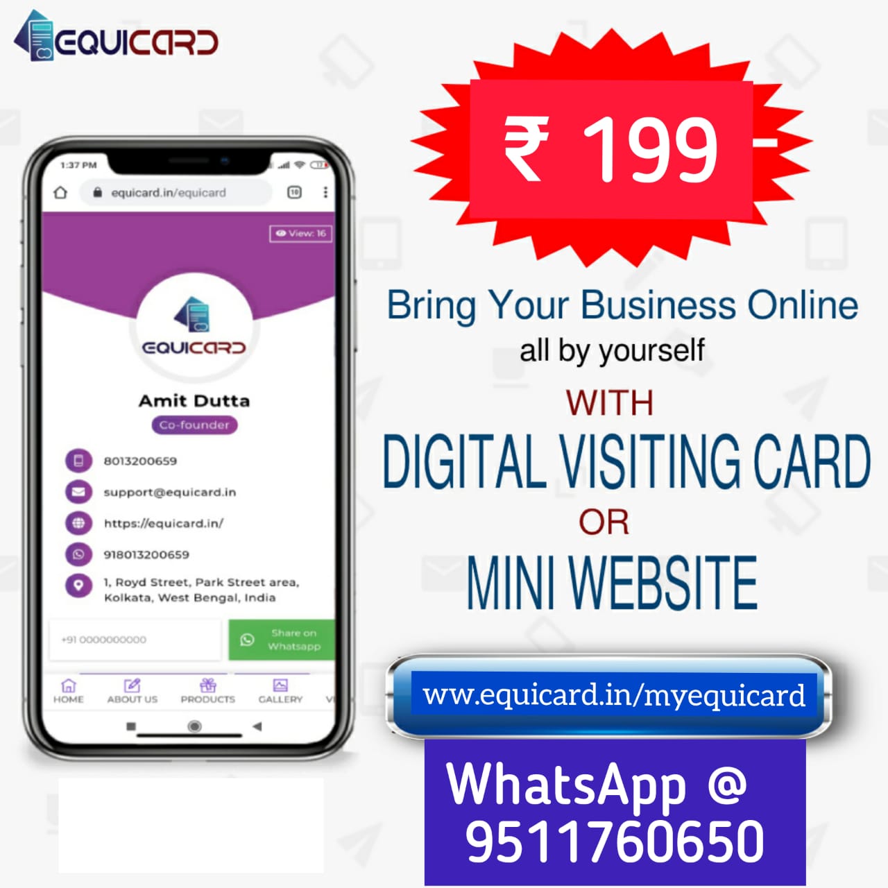 GO ONLINE WITH EQUICARD AT JUST RS. 99. STOP WORRING ABOUT LOCKDOWN. PROMOTE AND SHARE YOUR BUSINESS ONLINE. WHY WAIT??? CONTACT US AT +91 9511760650 or MAIL US at shriconsultant7@gmail.com